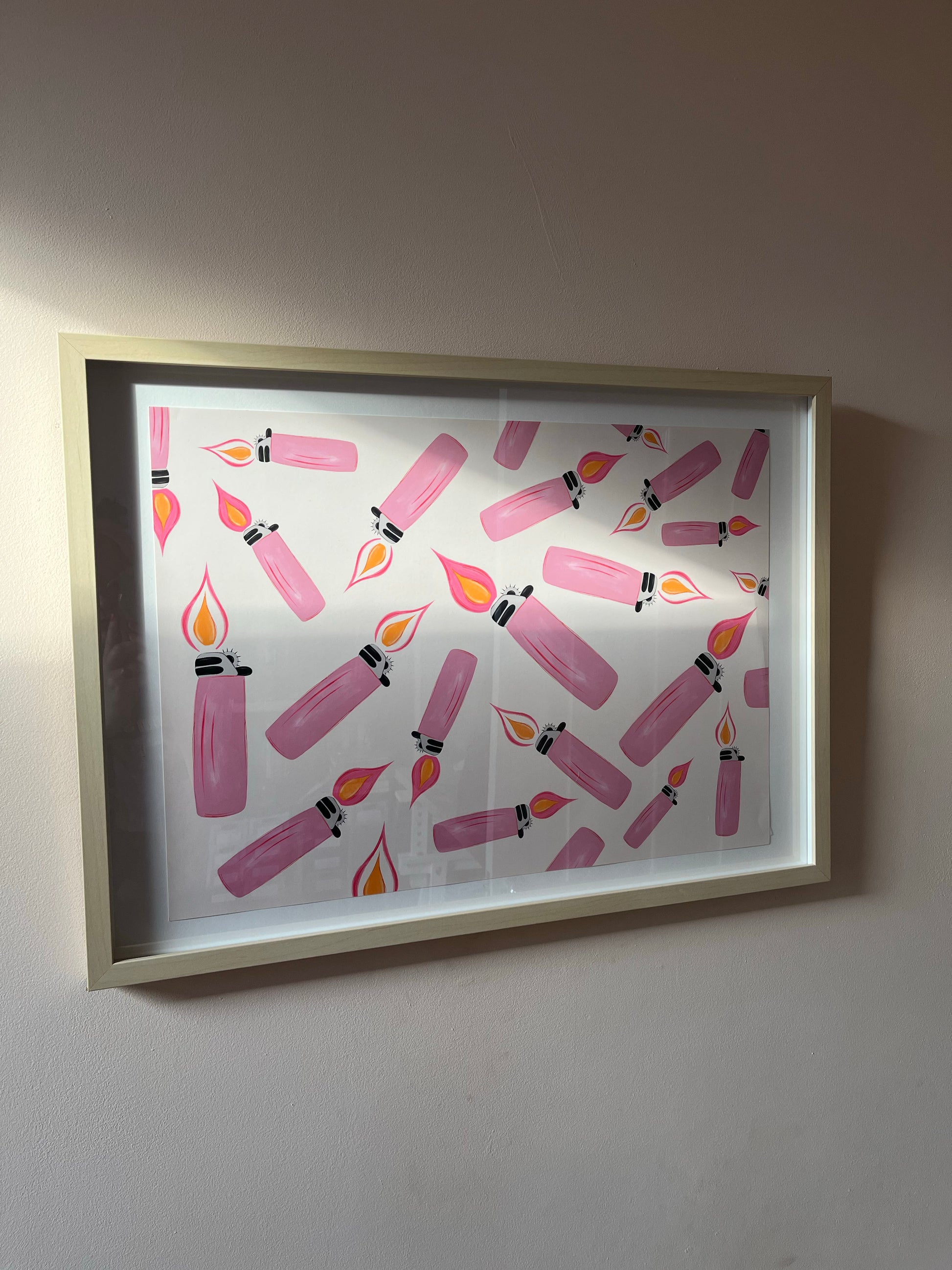 Vibrant hand drawn illustration of a college of pink lighters.